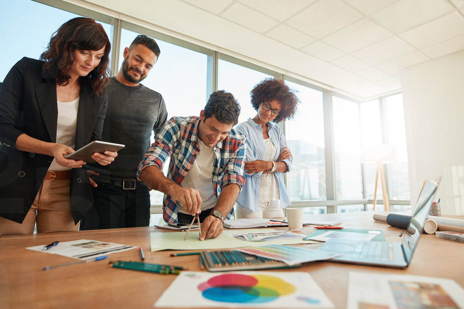 Team of young professionals working together in creative office. Creative people workplace in office.