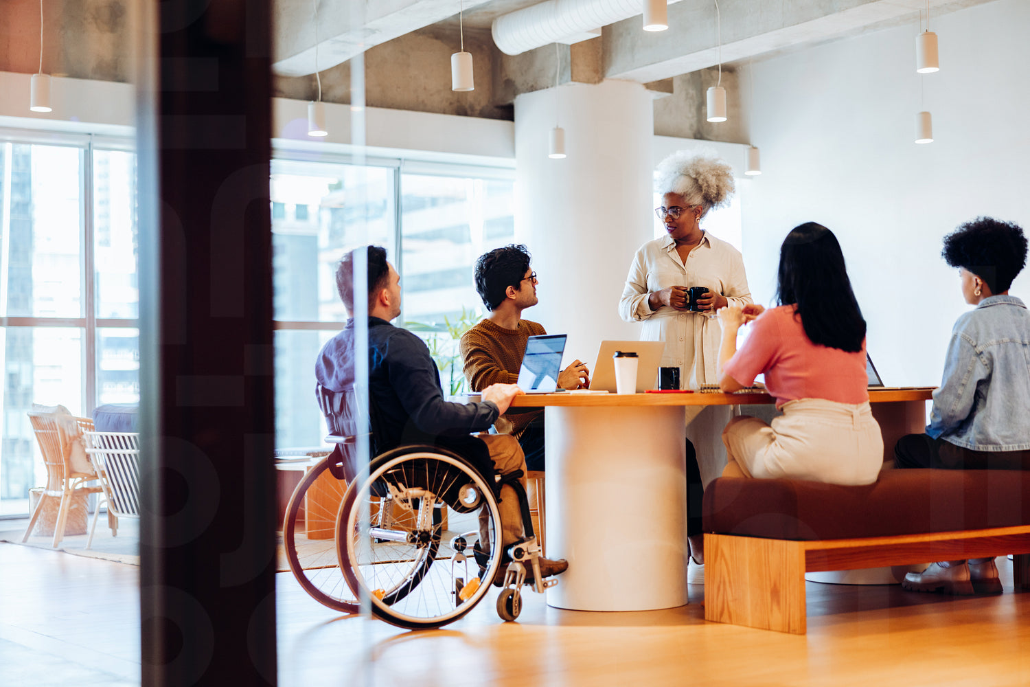 A diverse group gathers around a round table in a modern office, collaborating on laptops, coffee, and notes as a standing colleague shares ideas.