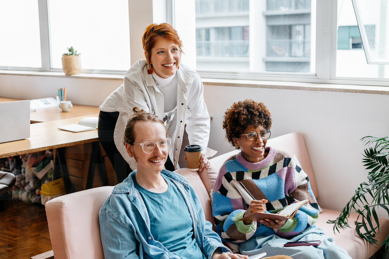 A diverse group of colleagues engage in a project in a bright, well-organized freelance office environment. They are focused, discussing ideas and taking notes, embodying teamwork and productivity in a casual work setting.