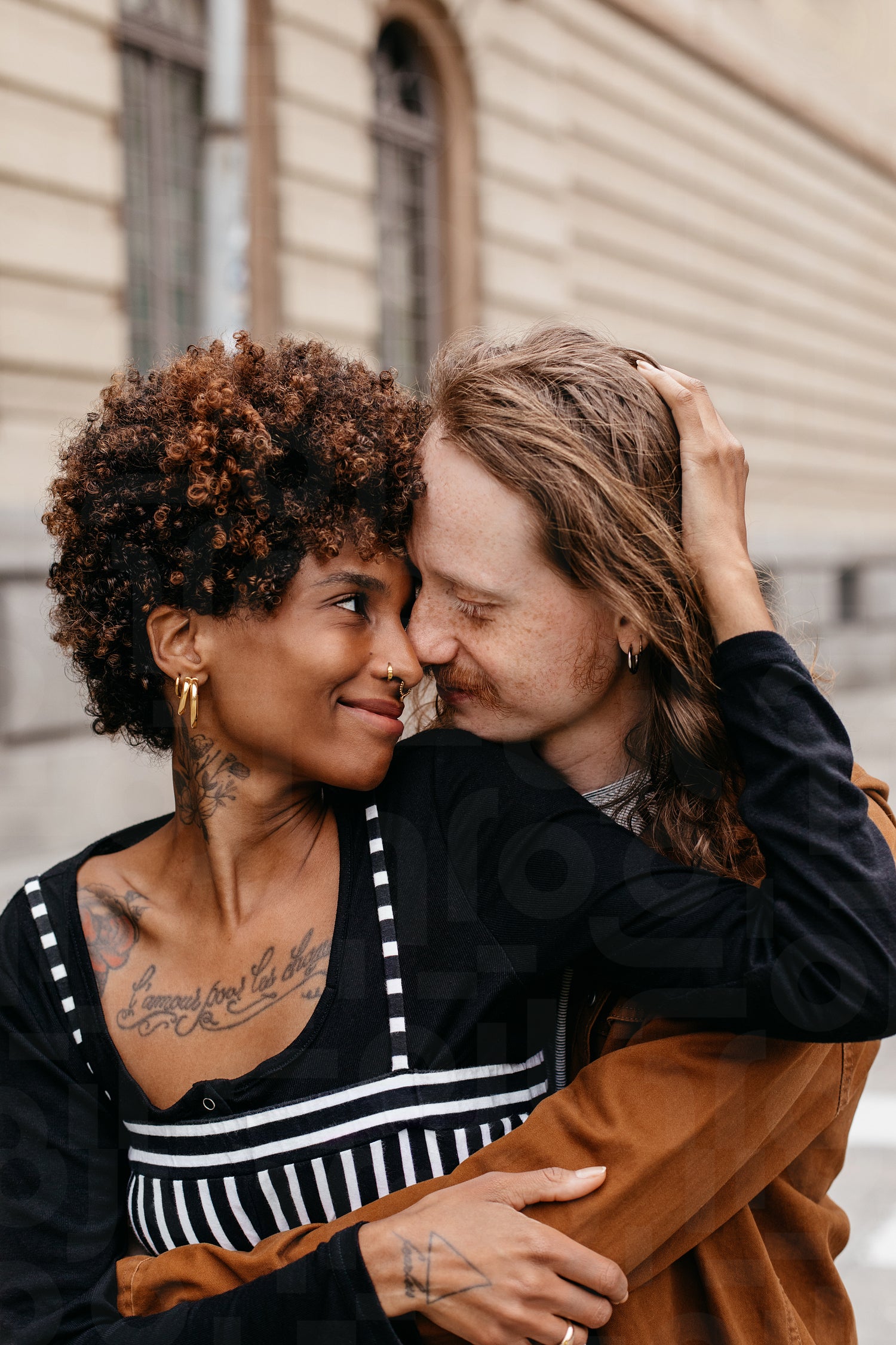 A candid moment of a young couple sharing an affectionate embrace outdoors. They stand in an urban setting, evoking feelings of romance, connection, and spontaneity.