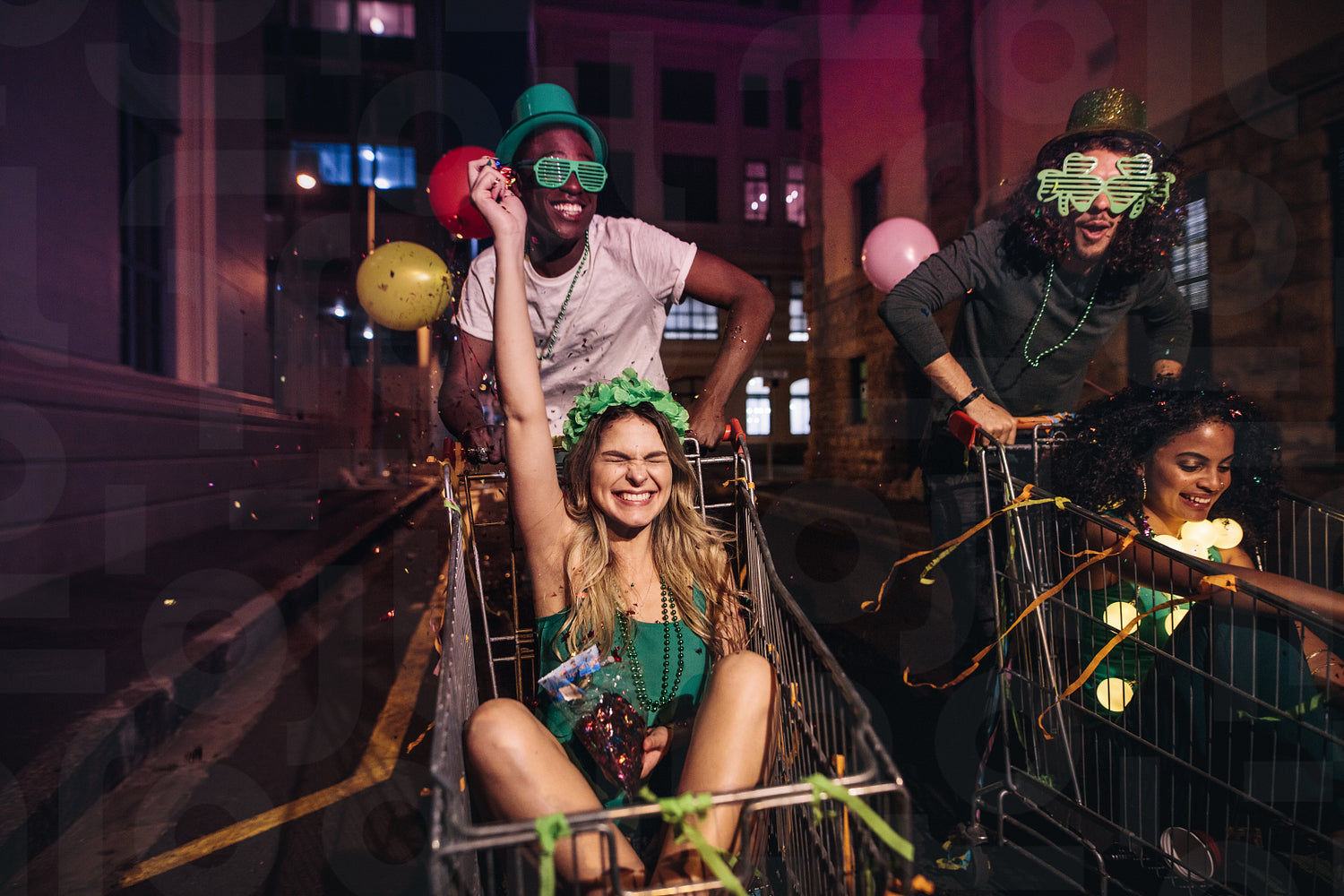 Young friends at night with confetti enjoying party. Group of friends with confetti on road in evening.