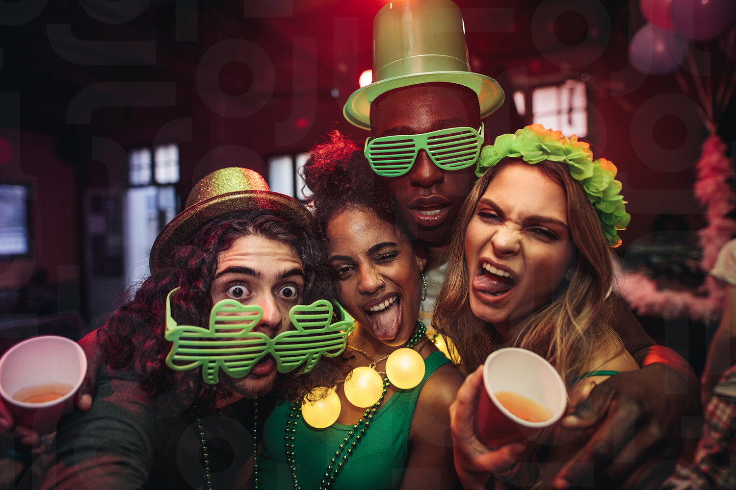 Crazy young friends enjoying a party at pub. Men and women in green clover party glasses and leprechaun hat at night club. People celebrating St.Patrick's day.