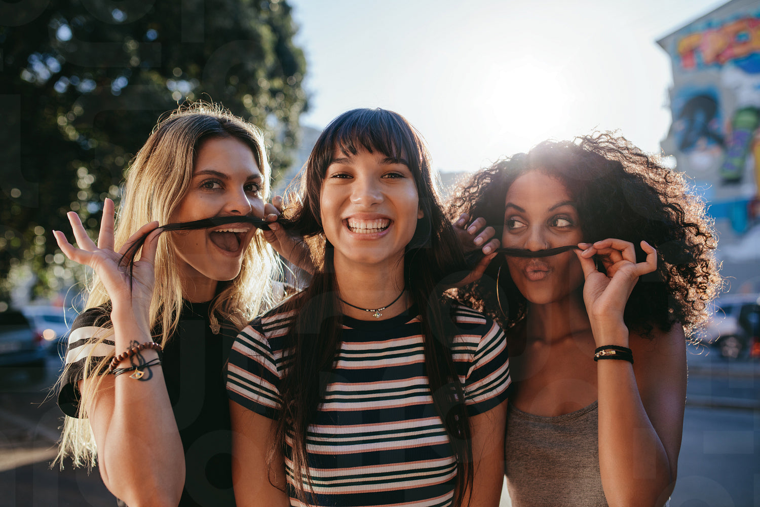 Happy and smiling young women playing with hair and pretending to have mustaches. Girls making mustaches with hair while standing on city street.