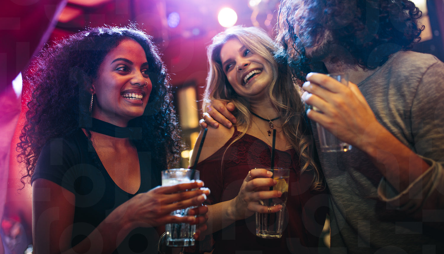 Happy young women partying friends at bar. Group of friends having a good time at nightclub.