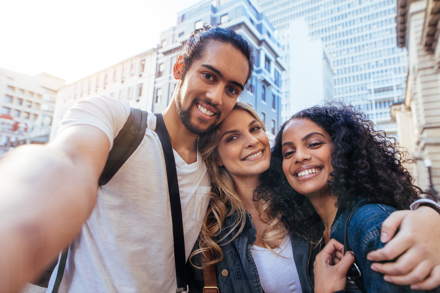 Cheerful man with two women friends clicking a selfie with city buildings in the background. Friends having fun while exploring the city.
