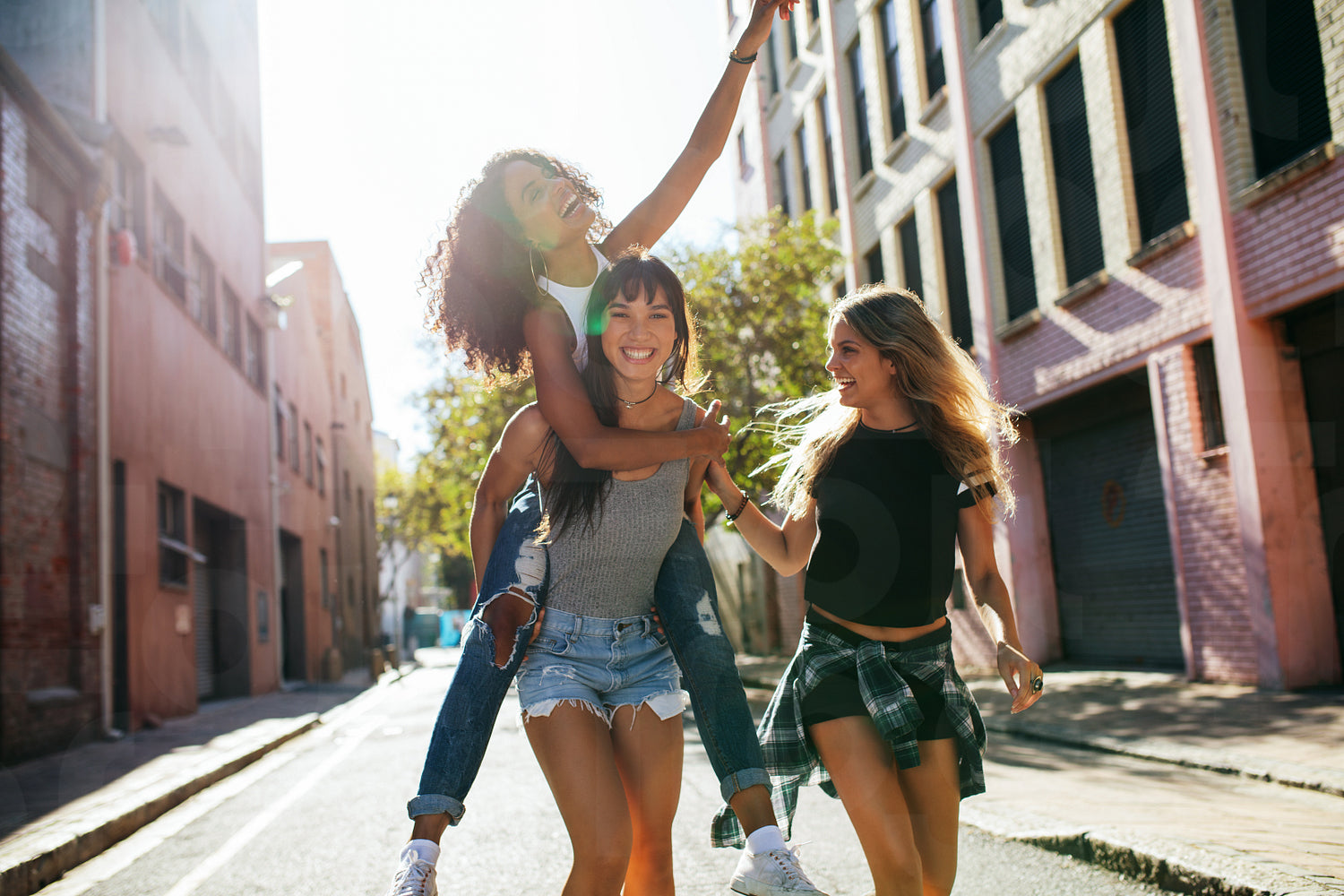 Outdoor shot of young woman carrying her female friend on her back. Three young women having fun on city street.