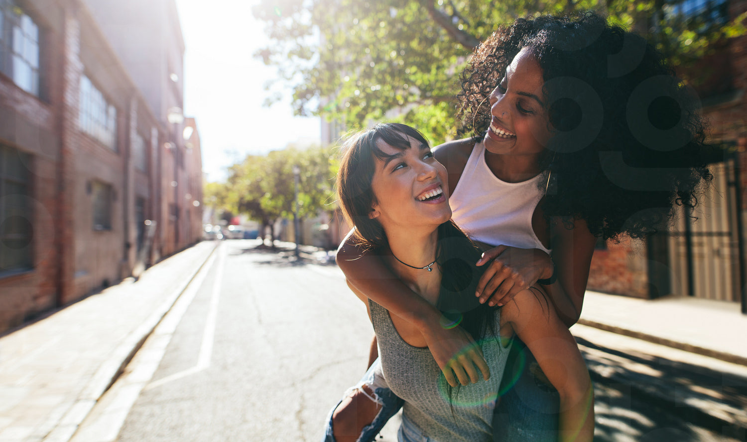 Outdoor shot of young woman carrying her female friend on her back. Two young woman having fun on city street.