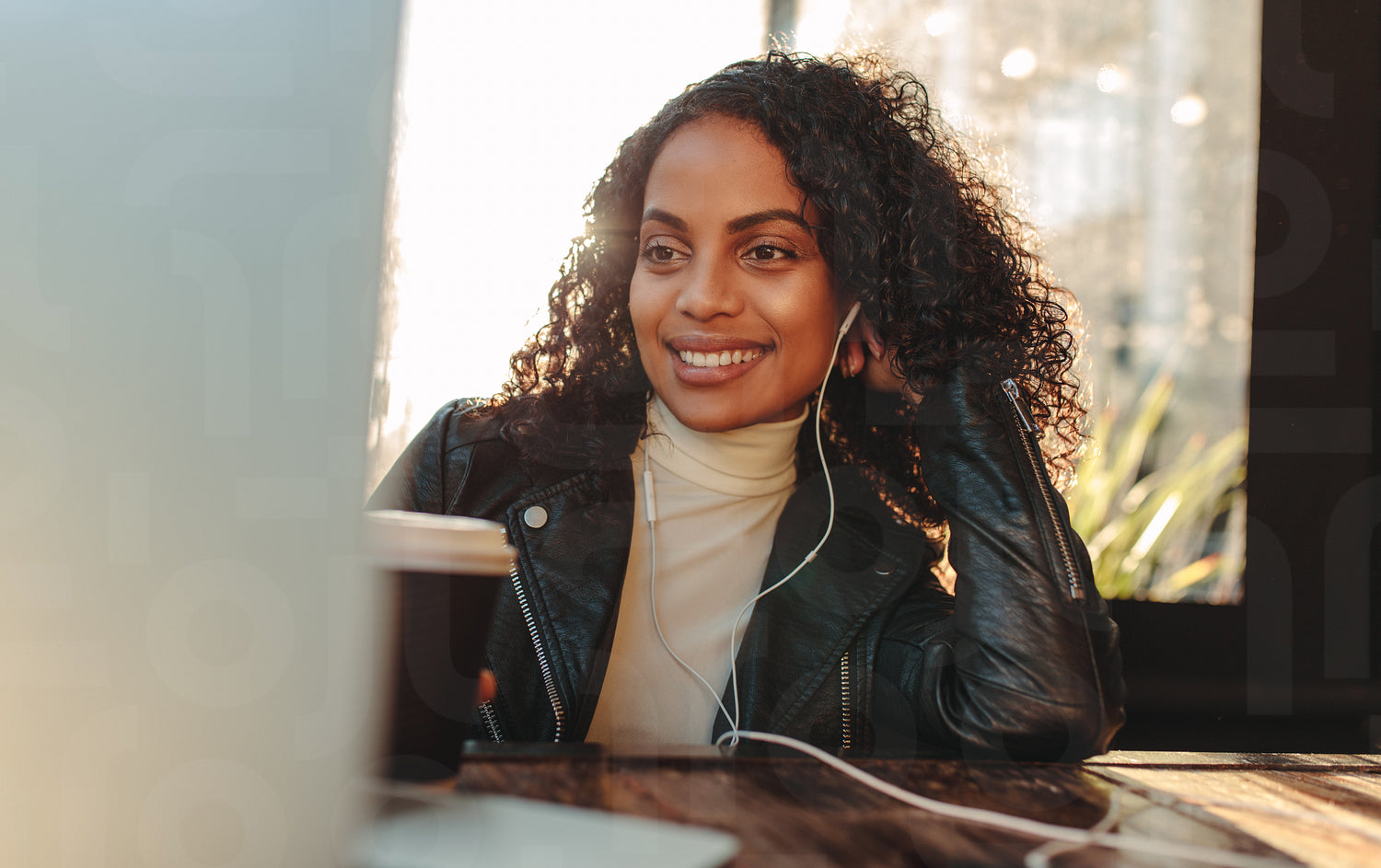 Smiling woman looking at laptop while listening to music on earphones. Woman sitting with coffee glass and laptop at a coffee shop.