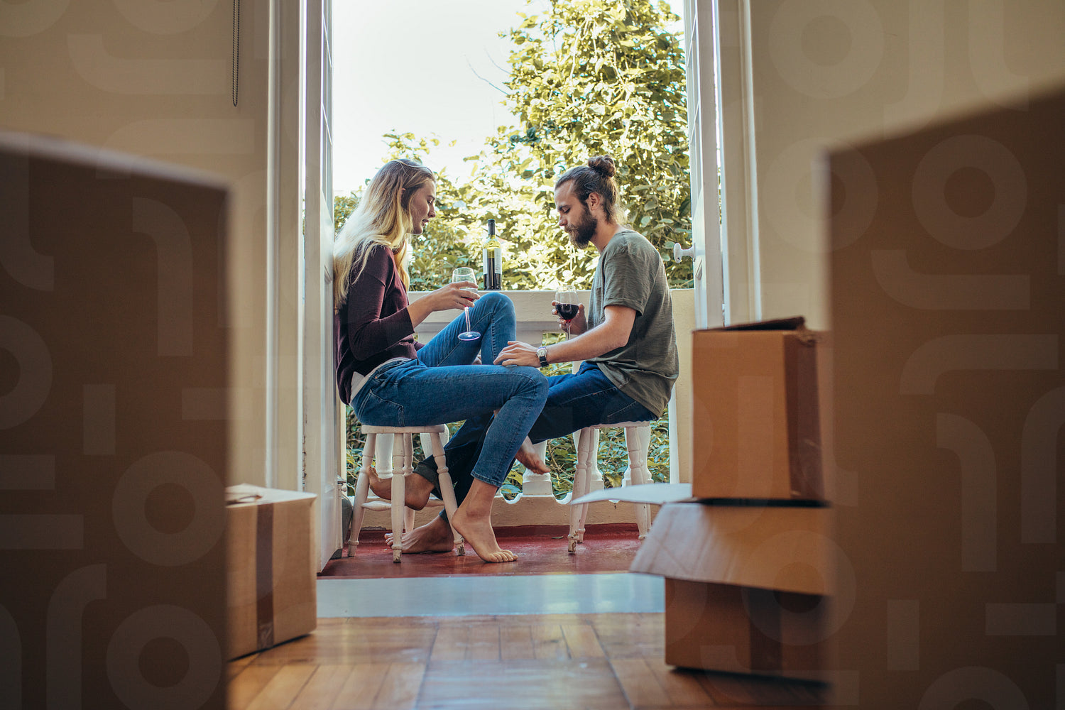 Couple sitting in the balcony and drinking wine. Couple moving in to a new home sitting together drinking wine with packed boxes on the floor.