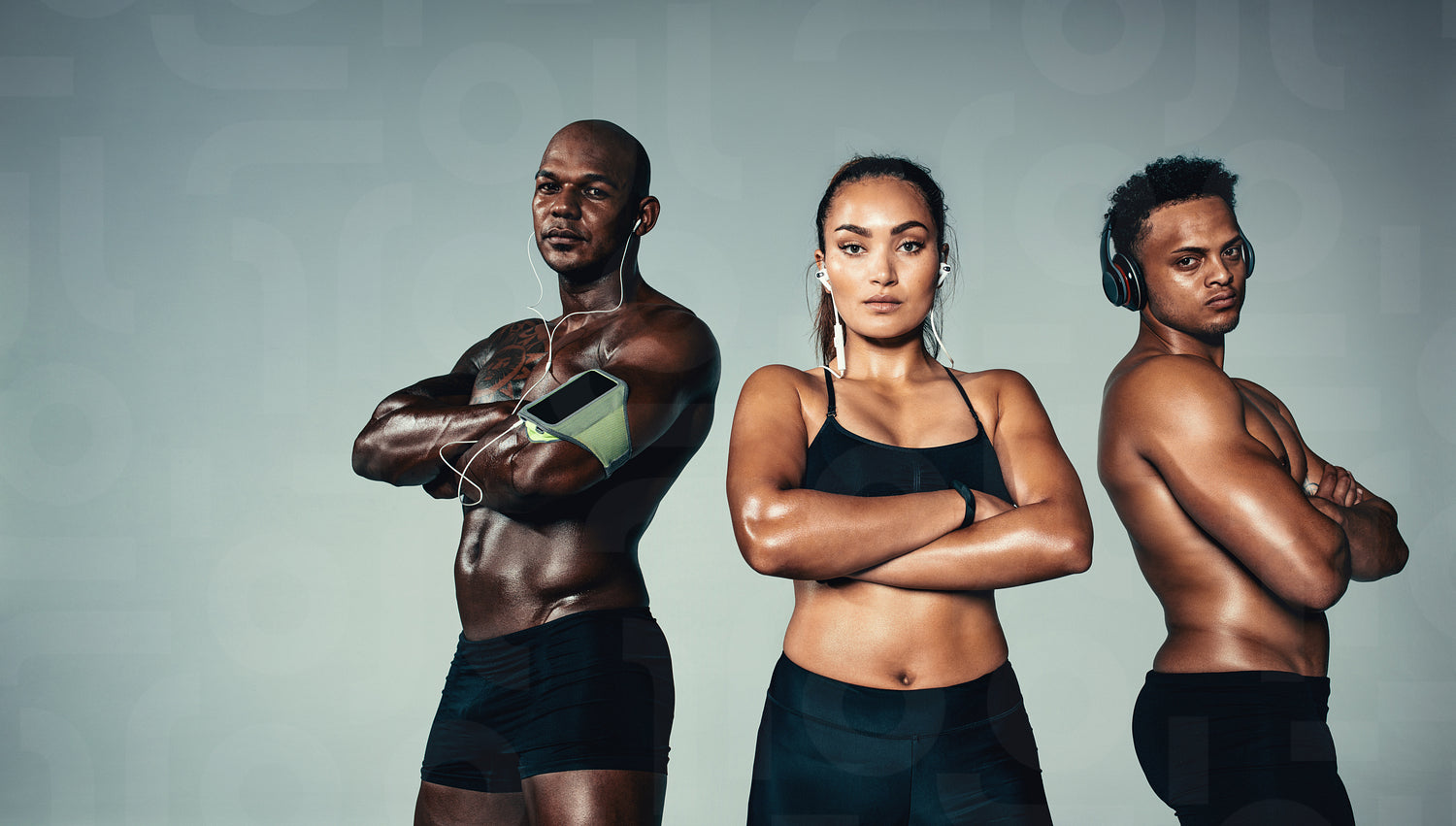 Portrait of three young fitness people with earphones standing together over grey background. Group of muscular people looking at camera.