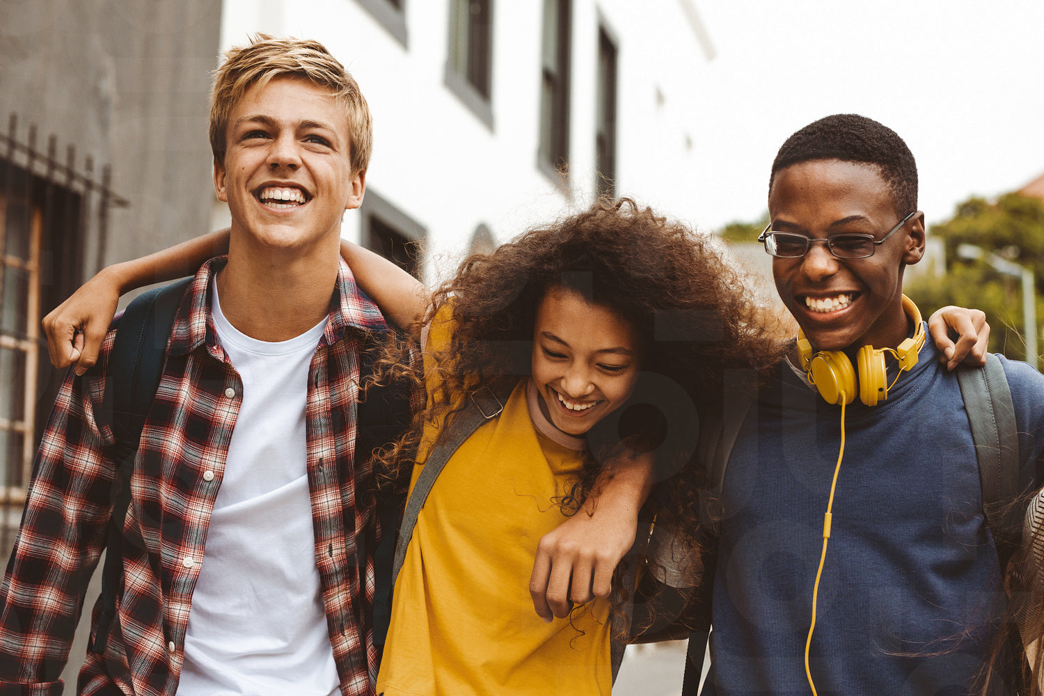 Close up of three college friends standing in the street with arms around each other. Cheerful boys and a girl wearing college bags having fun walking outdoors.