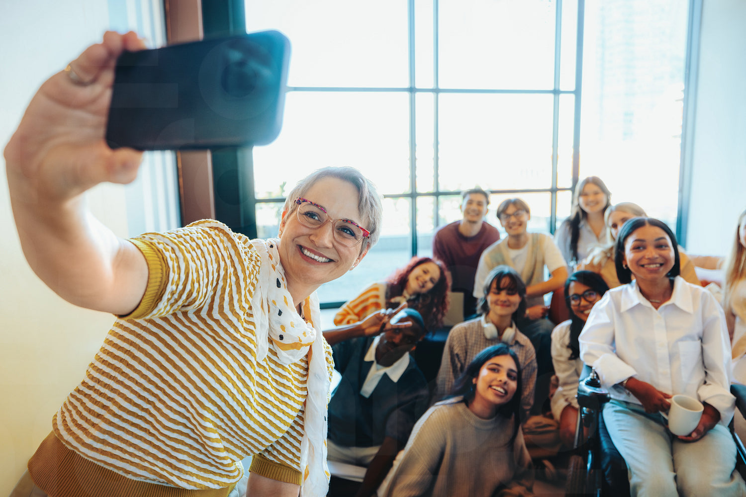 Joyful students pose with their mentor for a cheerful group selfie, capturing a moment of happiness and connection