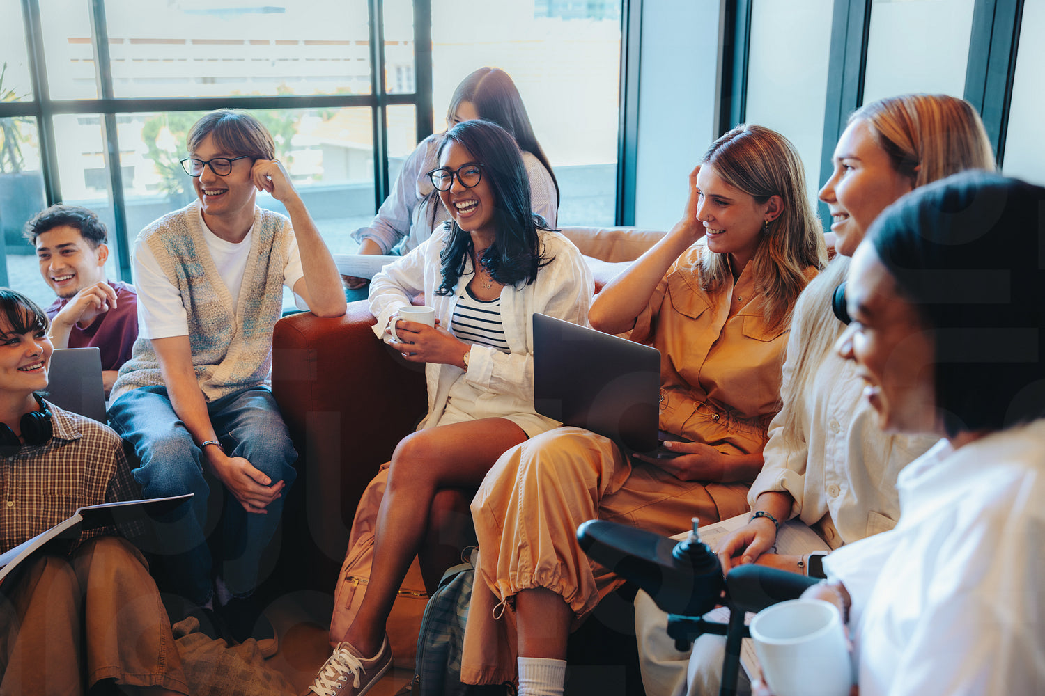 Multicultural group of students enjoying a lively school discussion in a modern classroom setting with laptops and notebooks