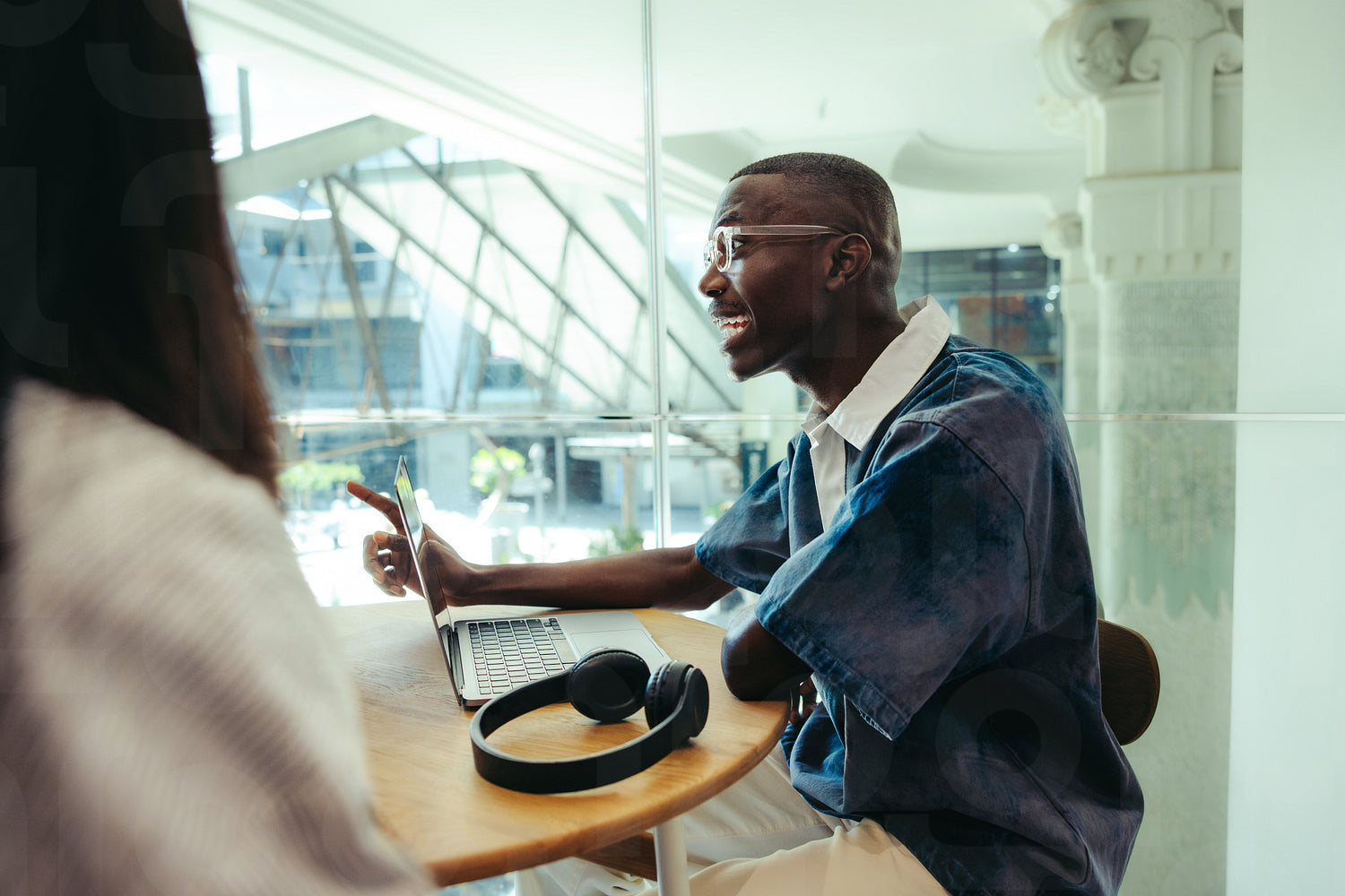 Urban college student engaging in a lively discussion inside a modern campus building with a laptop on a table
