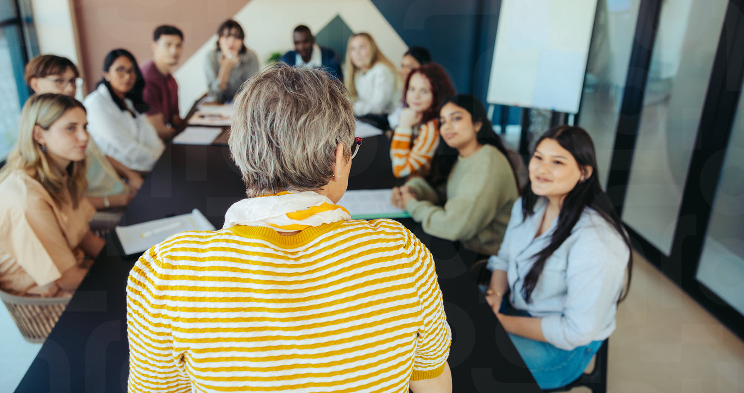 Young students attentively listening to a teacher during a classroom discussion in a modern educational setting
