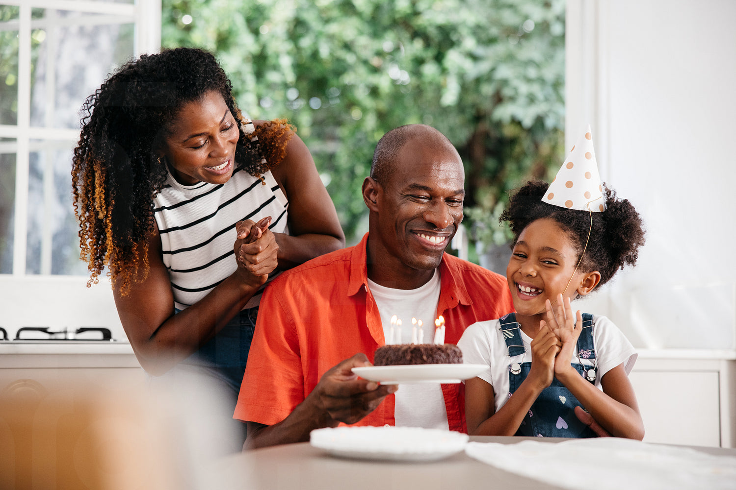 A father and his daughter smiling over a birthday cake, while the mother happily looks on. The daughter looks at the cake with excitement.