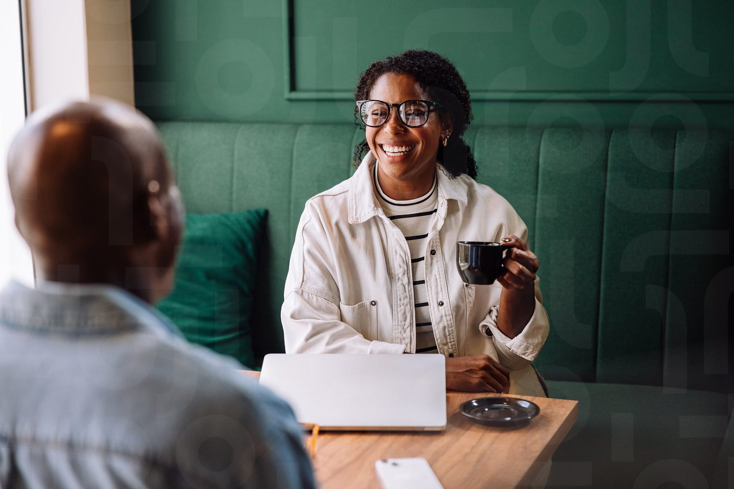 A joyful black woman engages in a productive conversation with her colleague over coffee in a contemporary office space. Their discussion is marked by smiles and a positive atmosphere.