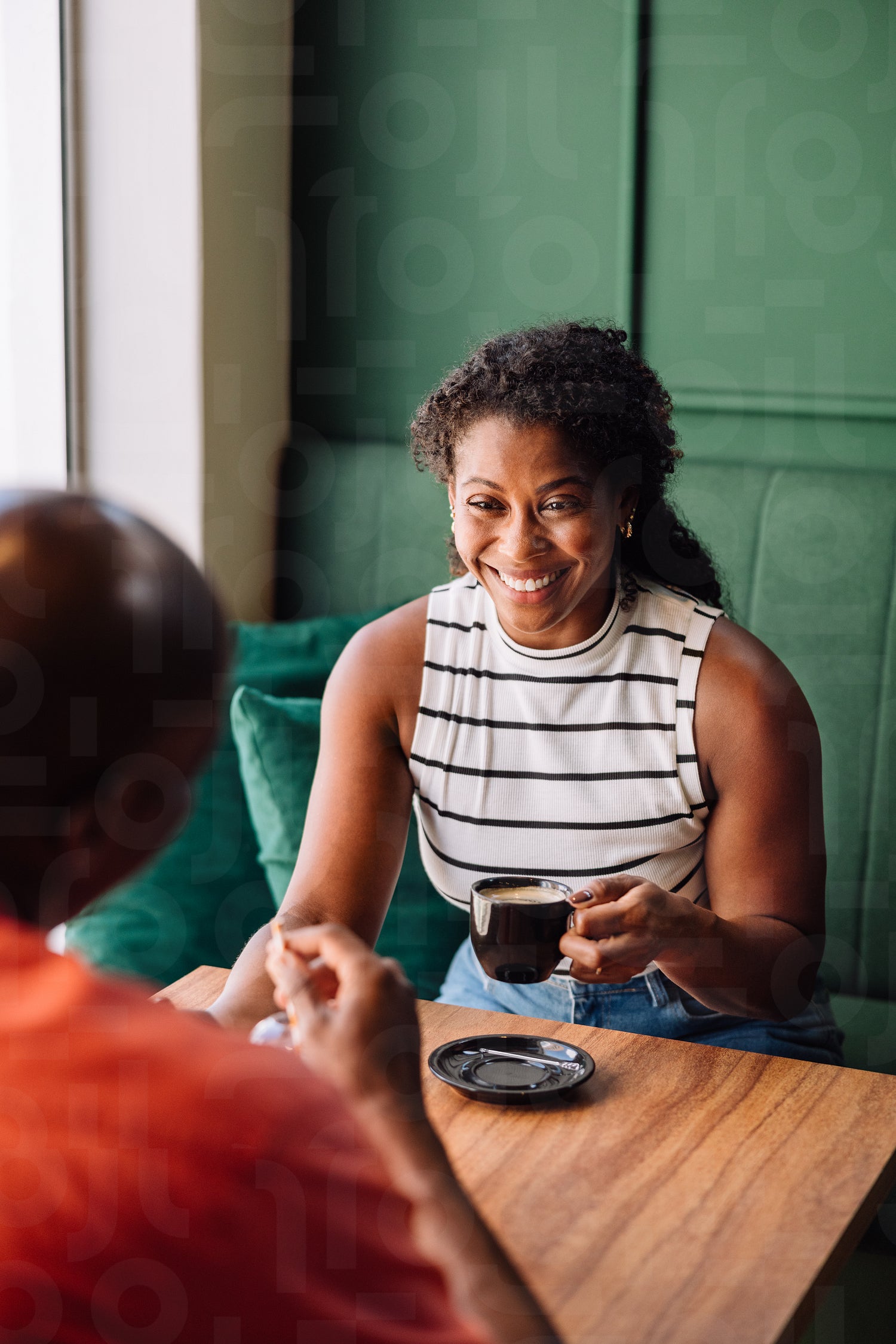 A joyful black woman is engaging in a light-hearted conversation with a companion in a cafe. Her radiant smile and casual attire convey a relaxed and happy atmosphere.