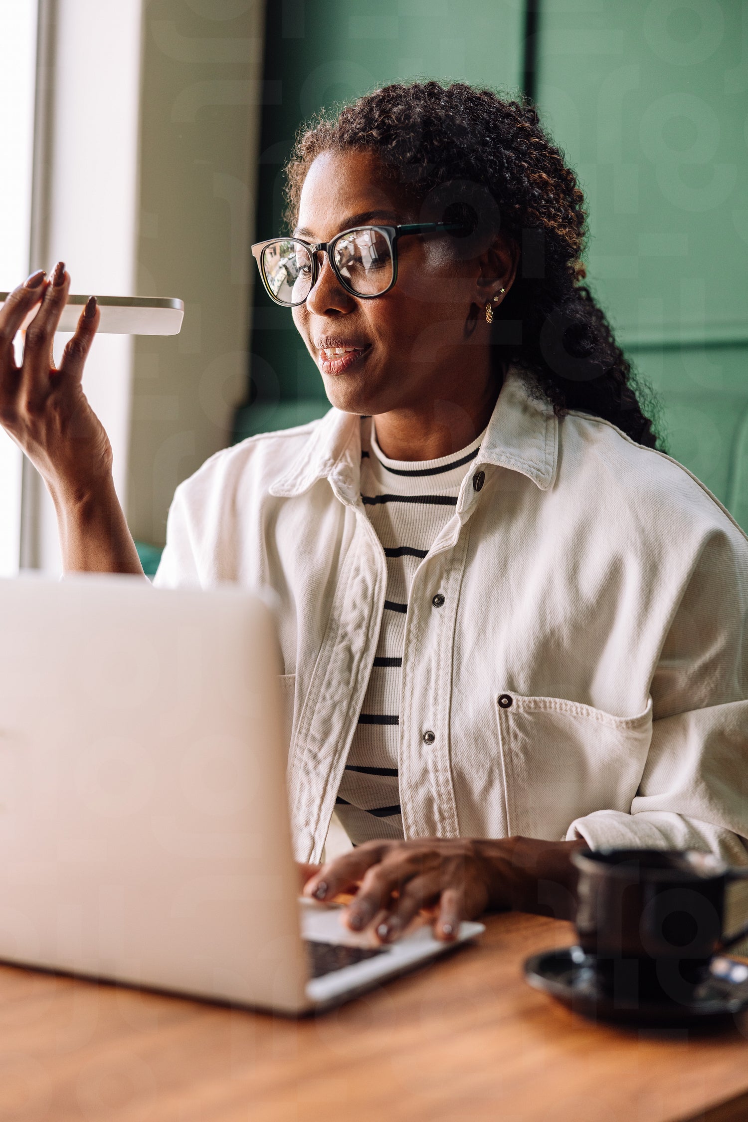 A joyful Black woman records a voice message on her phone, smiling as she works from her laptop in a cozy, well-lit room.