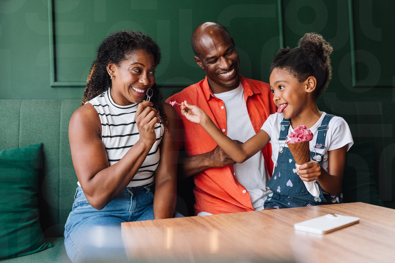 A happy black couple laughs with their daughter, who is eating an ice cream cone. They are sitting in a cozy cafe, sharing ice cream together.