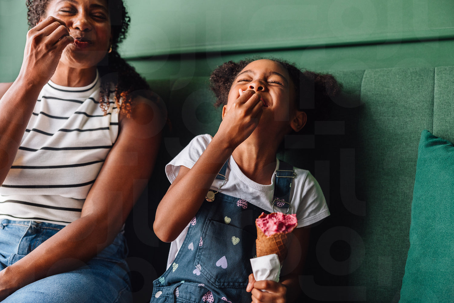 A joyful African American mother and her daughter smile together while they enjoy eating ice cream. Family bonding time with family on the couch.