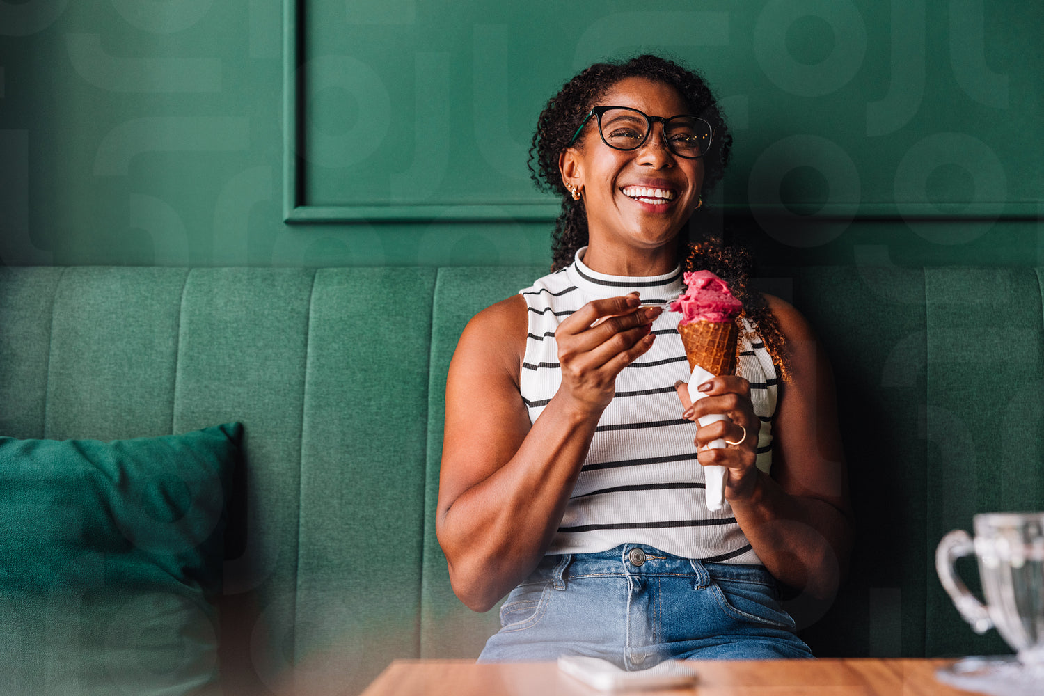 A joyful black woman smiling brightly as she savors a delicious ice cream cone while seated in a stylish cafe with a relaxed, happy demeanor.