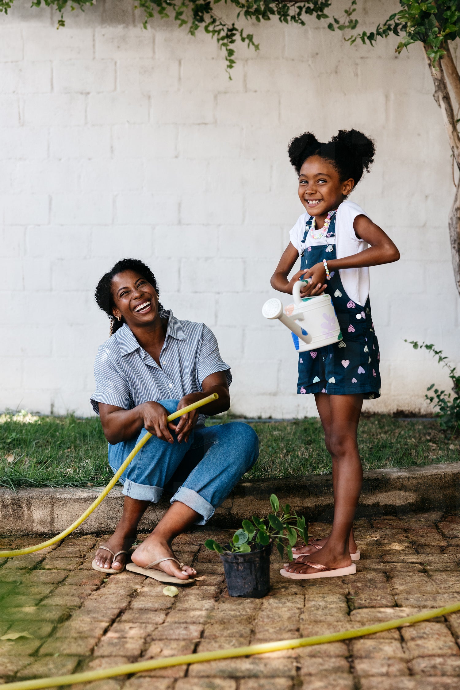 Happy mother and playful daughter gardening together outdoors, the child holding a watering can, both smiling and laughing.