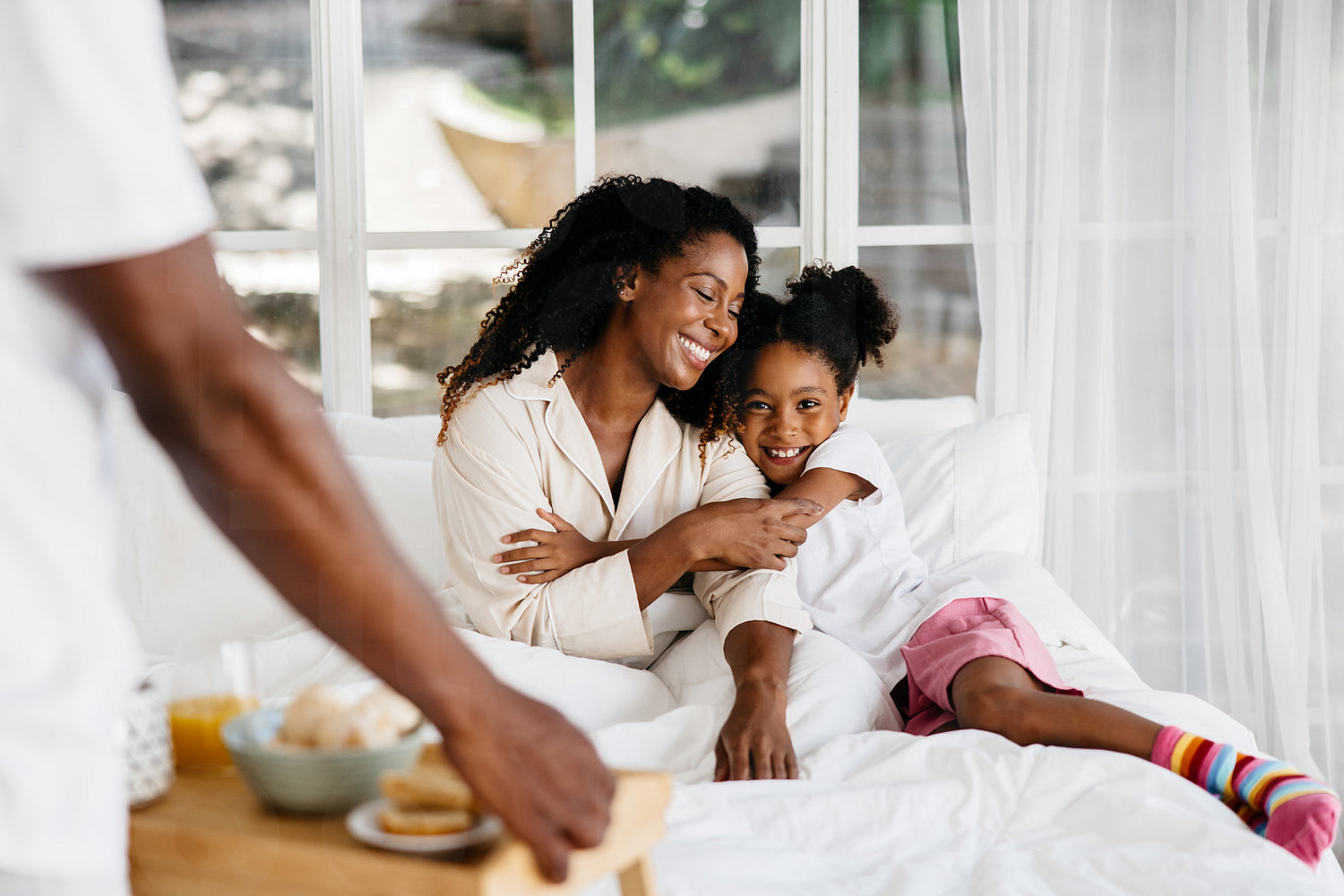 A black mother and daughter embracing on a bed, win a bright bedroom with father serving breakfast