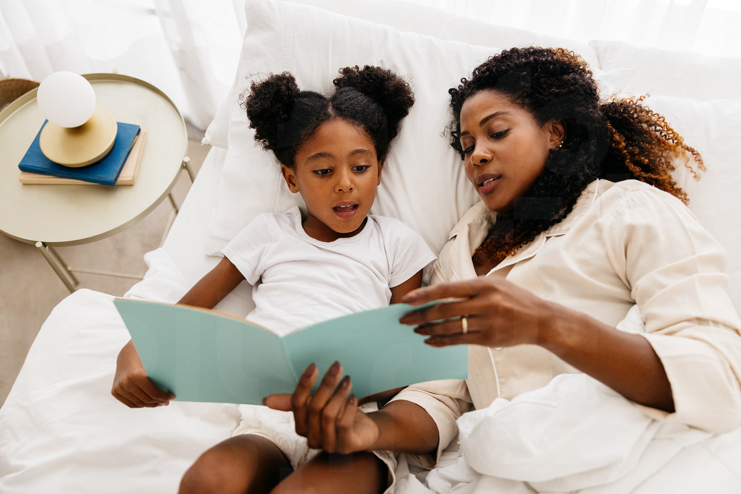 Mother and her young daughter reading in bed. Bonding time reading a book together in bed.