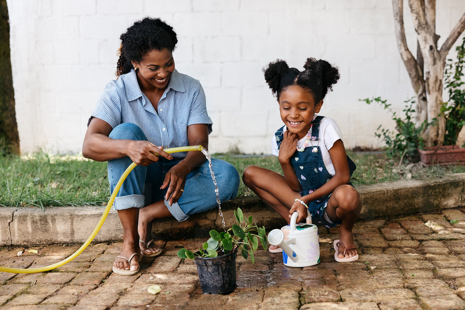 Black mother and young daughter enjoy gardening together, watering plants and filling a watering can in their backyard.