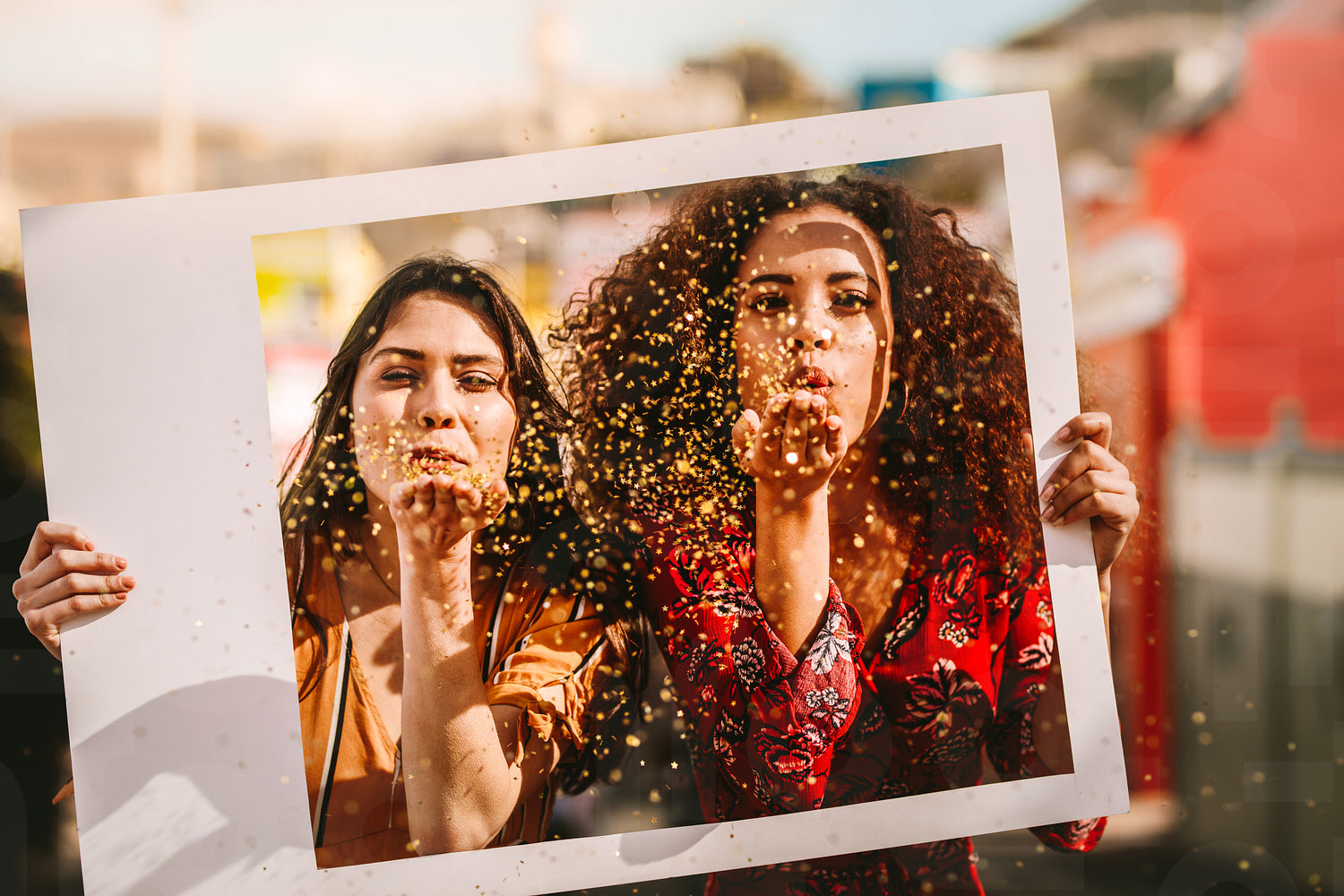 Beautiful young women blowing a burst of magic glitter through a big empty photo frame outdoors. Attractive female friends with picture frame blowing glitters.