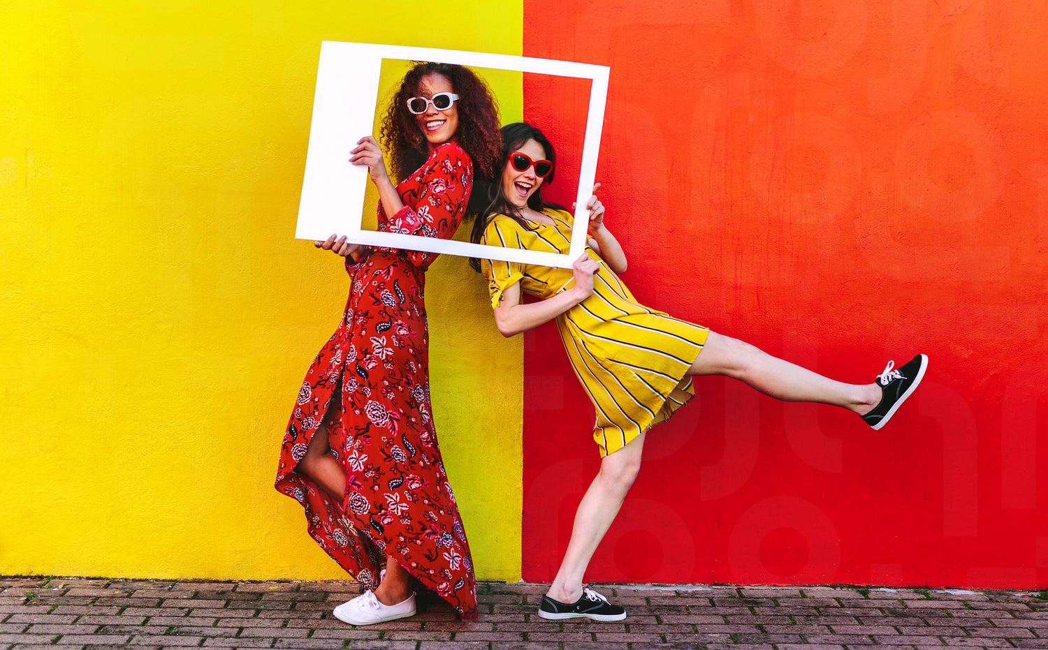 Two women friends with blank photo frame standing against colored wall outdoors. Female travelers posing at camera with empty picture frame.
