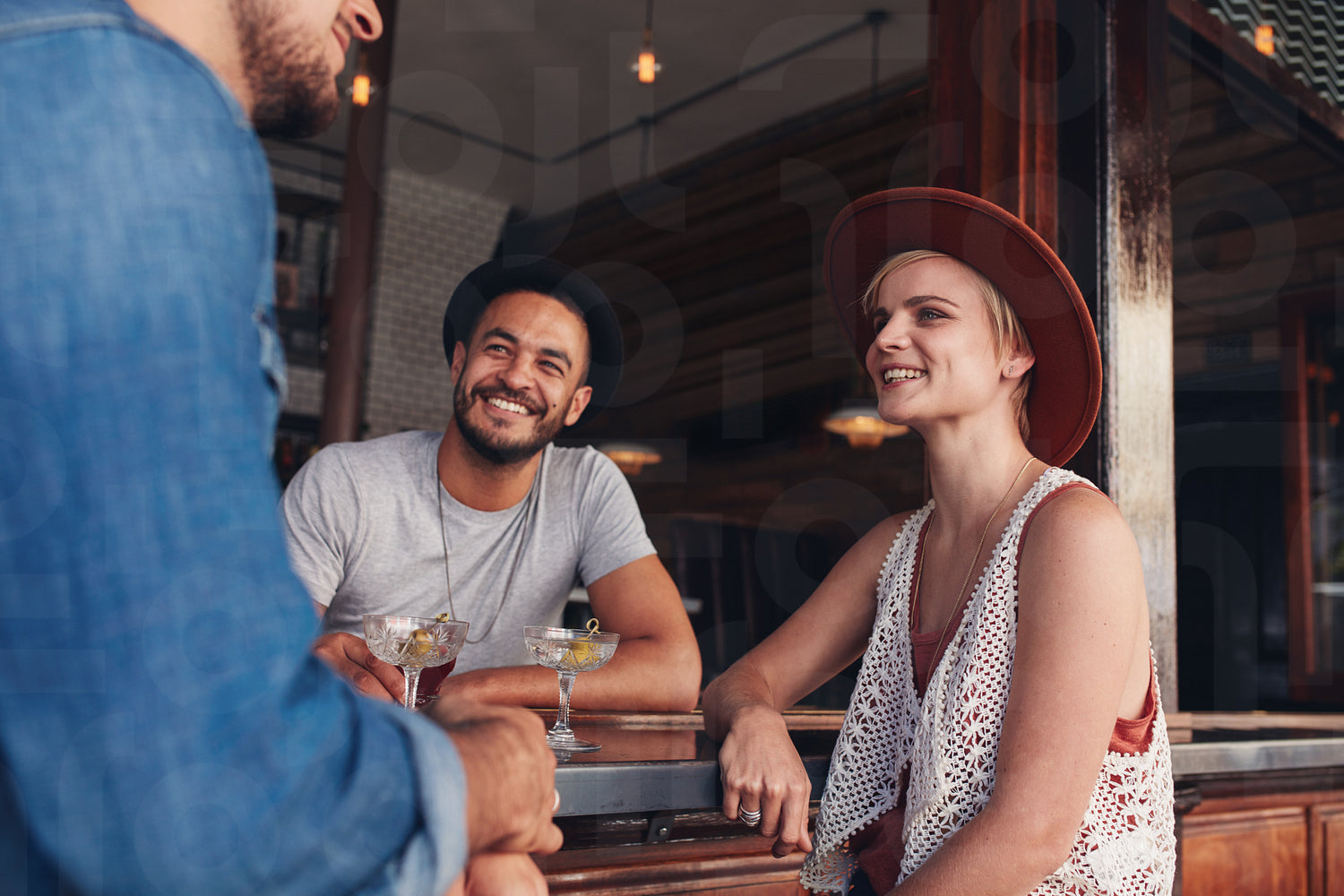 Group of young friends sitting and talking at a cafe. Young men and women meeting in a coffee shop.