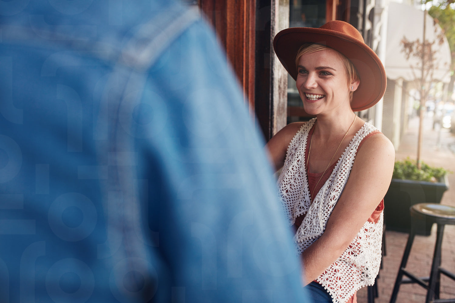 Smiling young woman sitting at a coffee shop with her friend. Young people sitting at a cafe table.