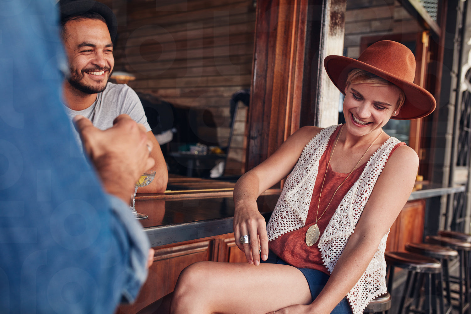 Smiling young caucasian woman wearing hat sitting at a coffee shop with her friends. Young people sitting at a cafe table and having fun.