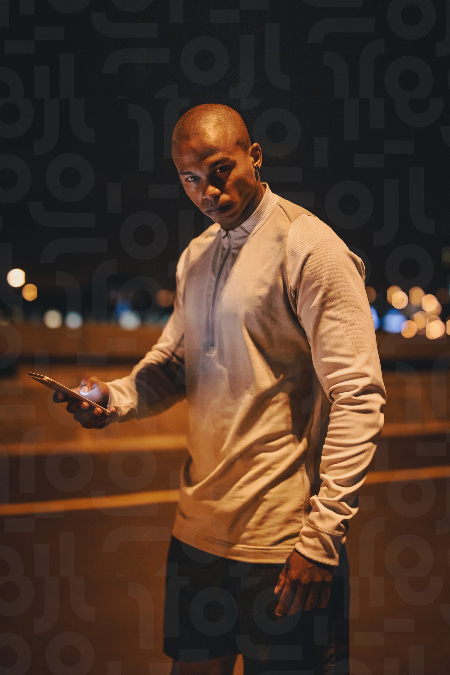 Sportsman standing oudtoors with mobile phone. Fintess man taking break after workout outdoors at night.