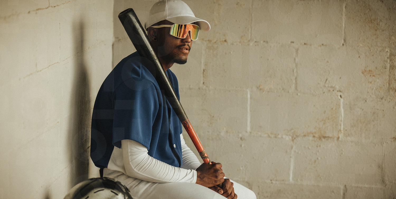 Baseball player sitting in a dugout wearing a blue jersey and holding a bat