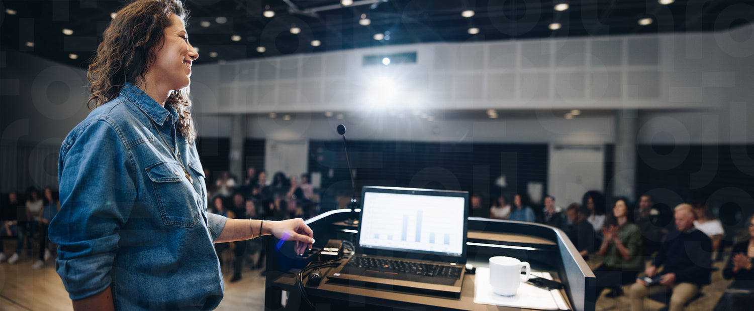 Wide angle shot of a female speaker standing at podium with laptop on the lectern and people sitting in the auditorium. Businesswoman giving a presentation in a corporate event.