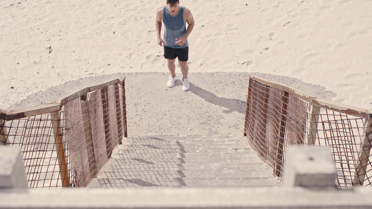 Muscular man exercising on the steps at the beach. Young man working out on the steps on beach.