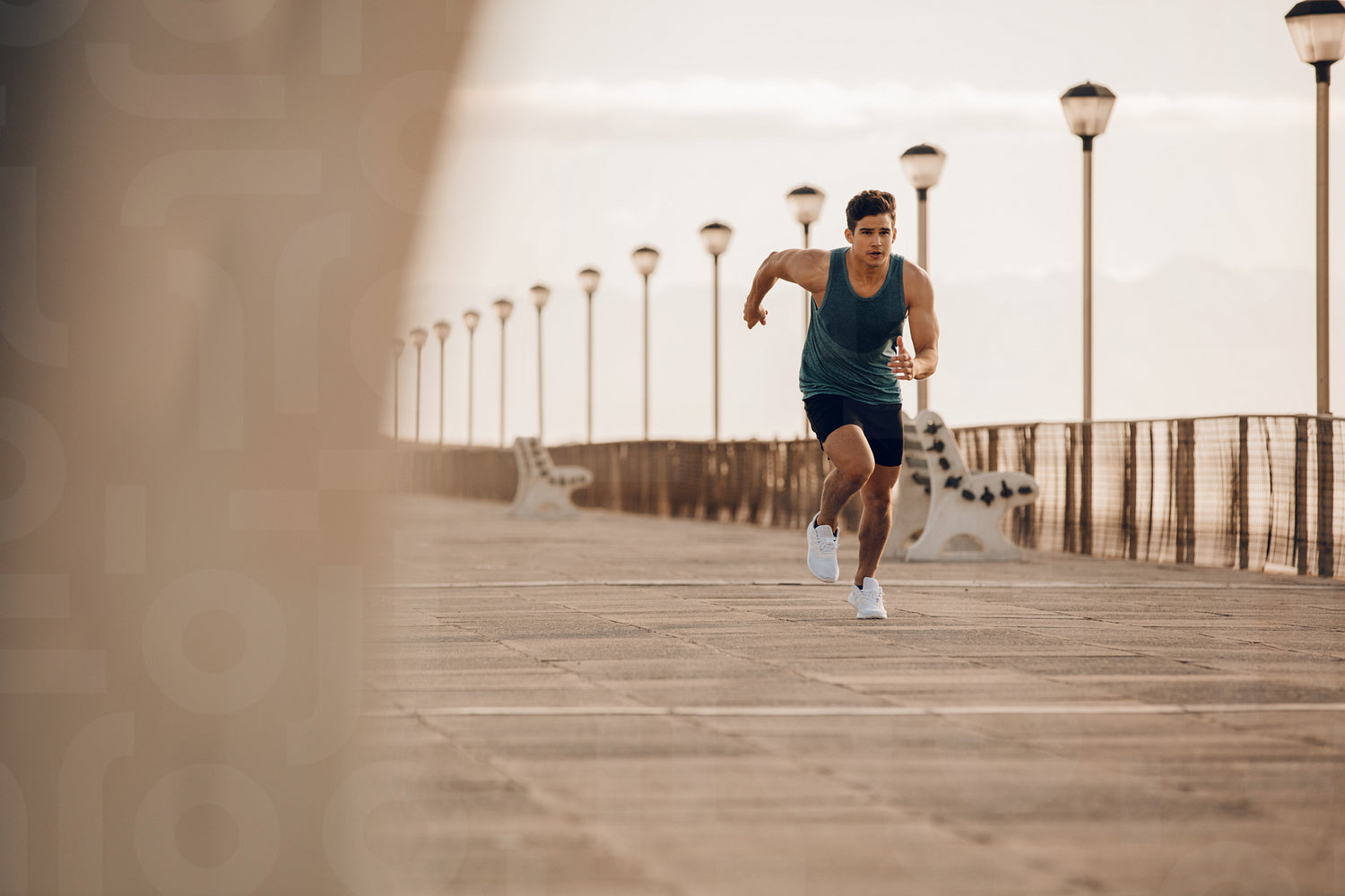 Full length shot of fit young man running fast on the promenade. Male runner sprinting in morning.