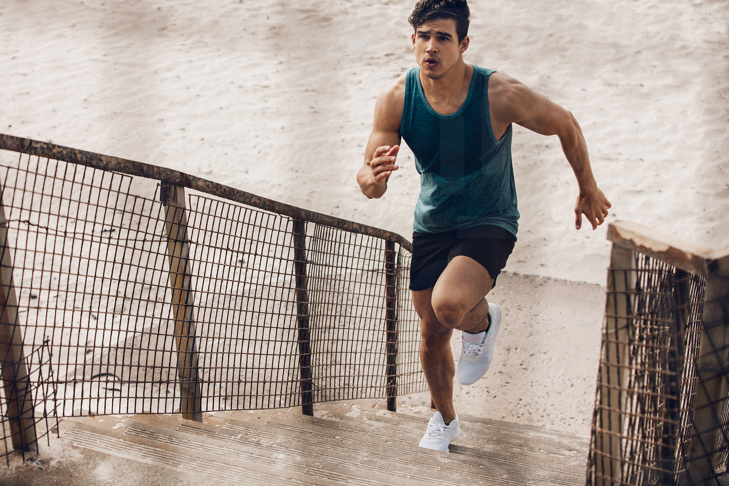 Fitness man running up the steps on beach