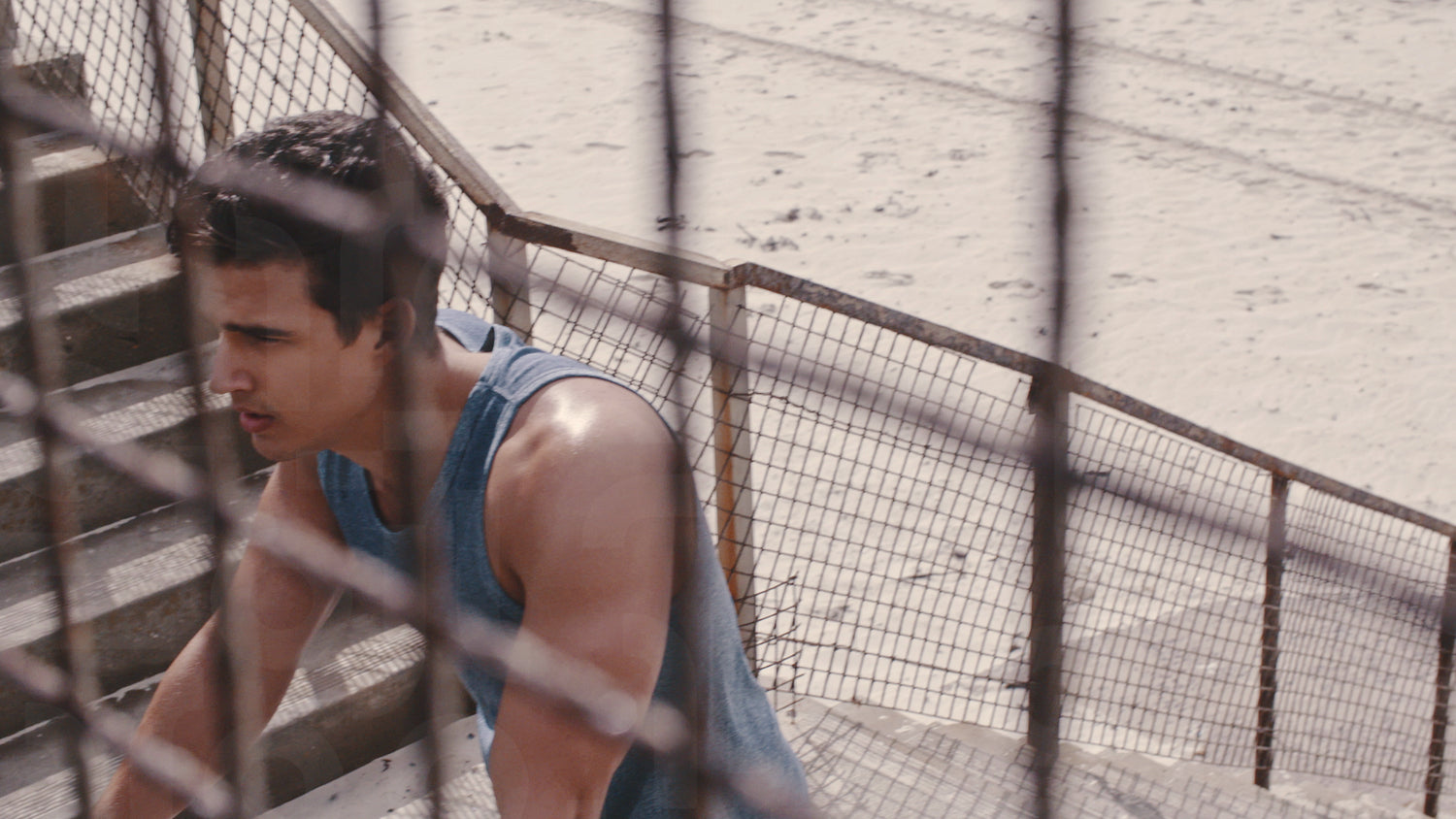 Young man with muscular body taking a break after workout on beach. Fitness male model resting after training session by a steps on sea shore.