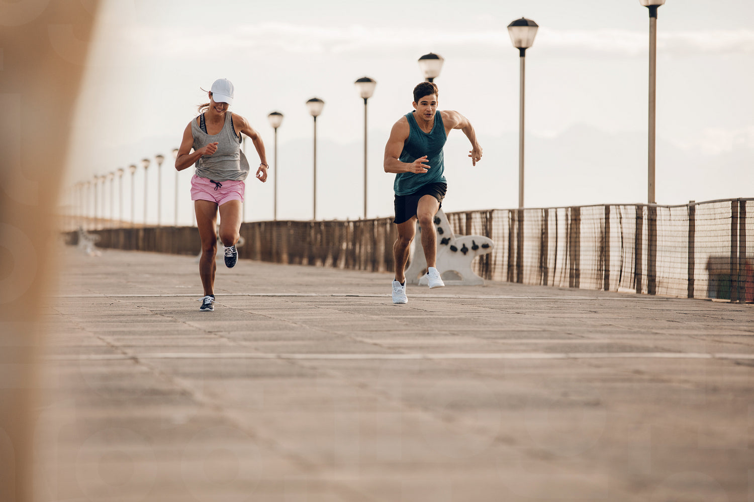 Young couple running along a seaside promenade. Healthy young runners sprinting outdoors in morning.