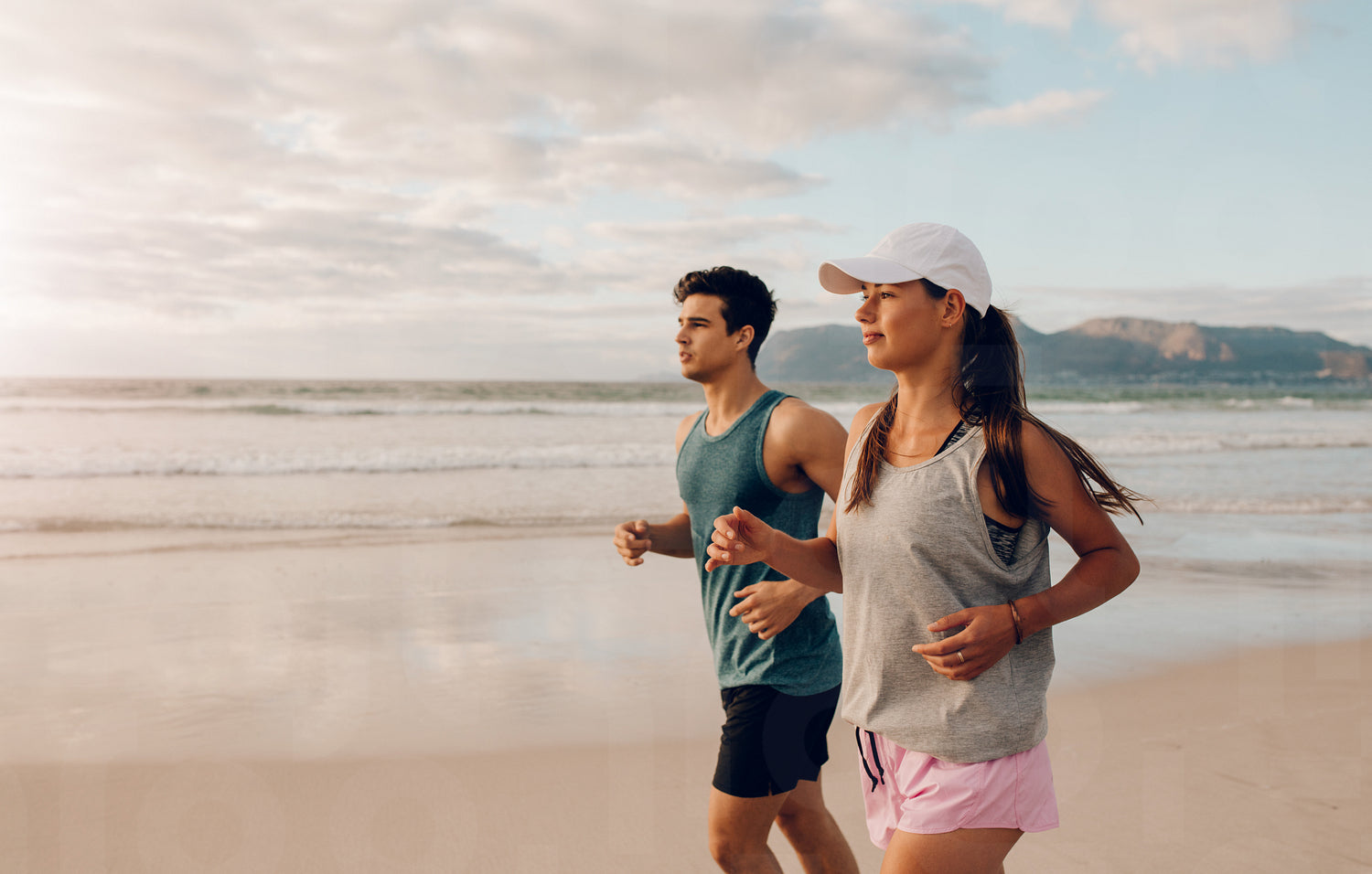 Shot of two people running on beach in morning. Young man and woman jogging outdoors during sunrise.