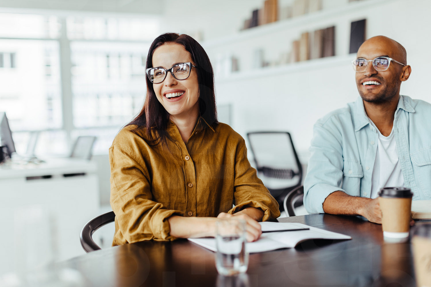 Happy business people listening to a discussion in an office. Young design professionals sitting in a team meeting.
