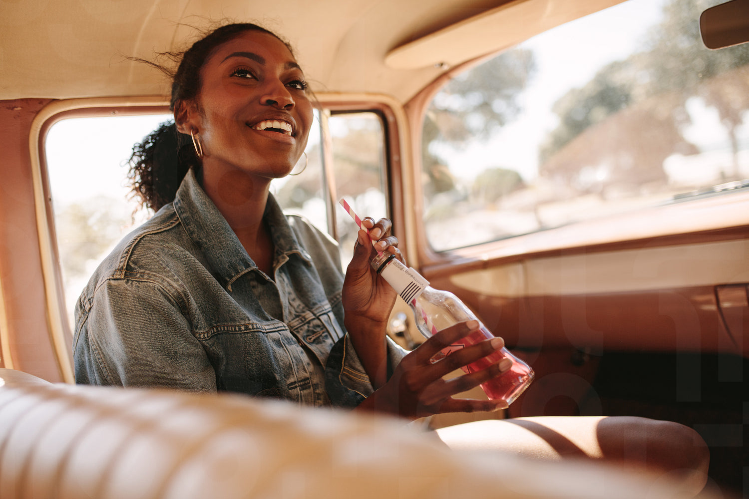 Attractive african woman going on a road trip. Female traveling by car and having soft drinks.