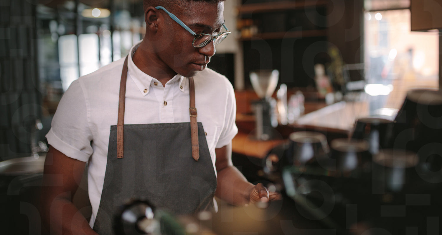 Coffee shop owner standing at the counter in his shop. Man working in his coffee shop wearing an apron.