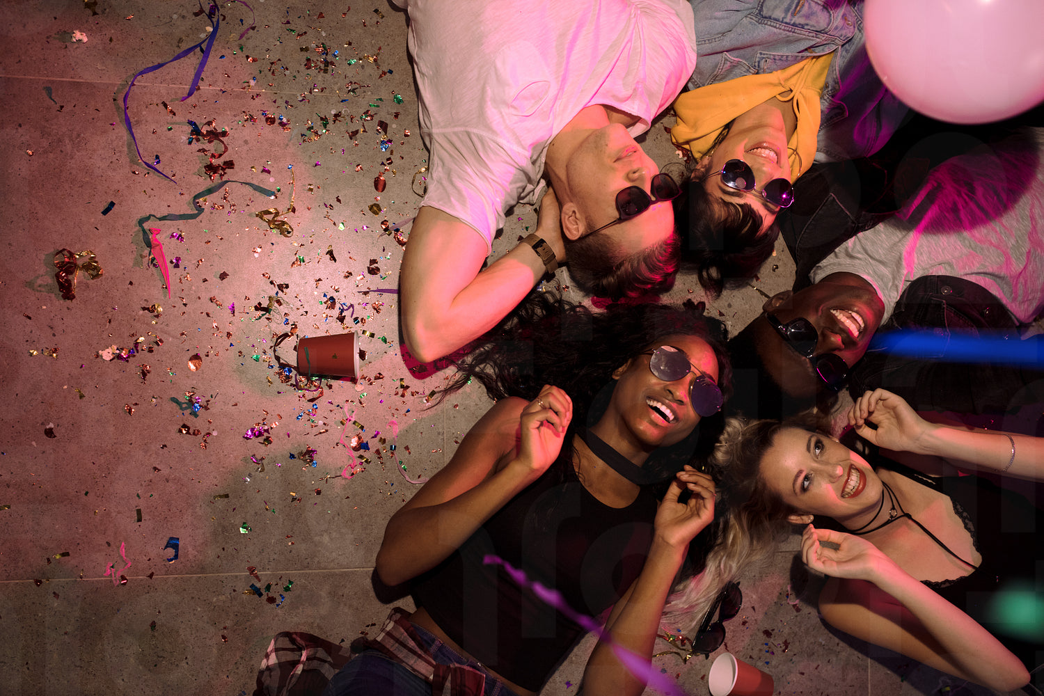 Top view of men and women lying on floor with heads in the centre and laughing at a house party. Friends lying on floor at the house party with cups and confetti around.