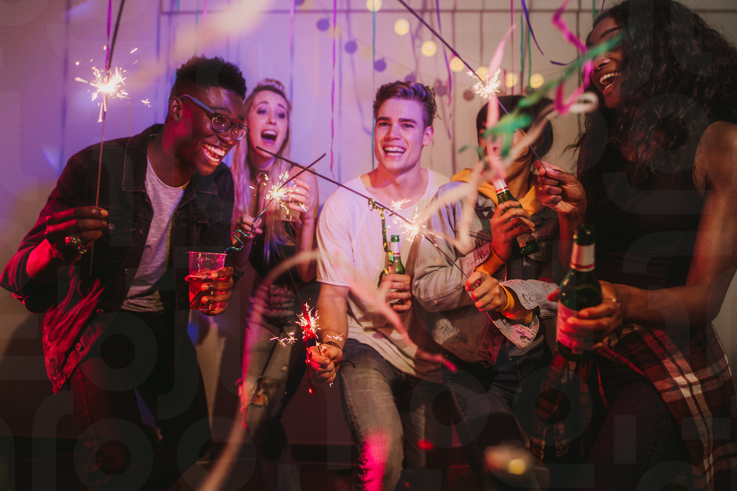Friends celebrating with fire sparkles and drinks at a house party. Young men and women having fun at a colorful house party with decorations and confetti all around.