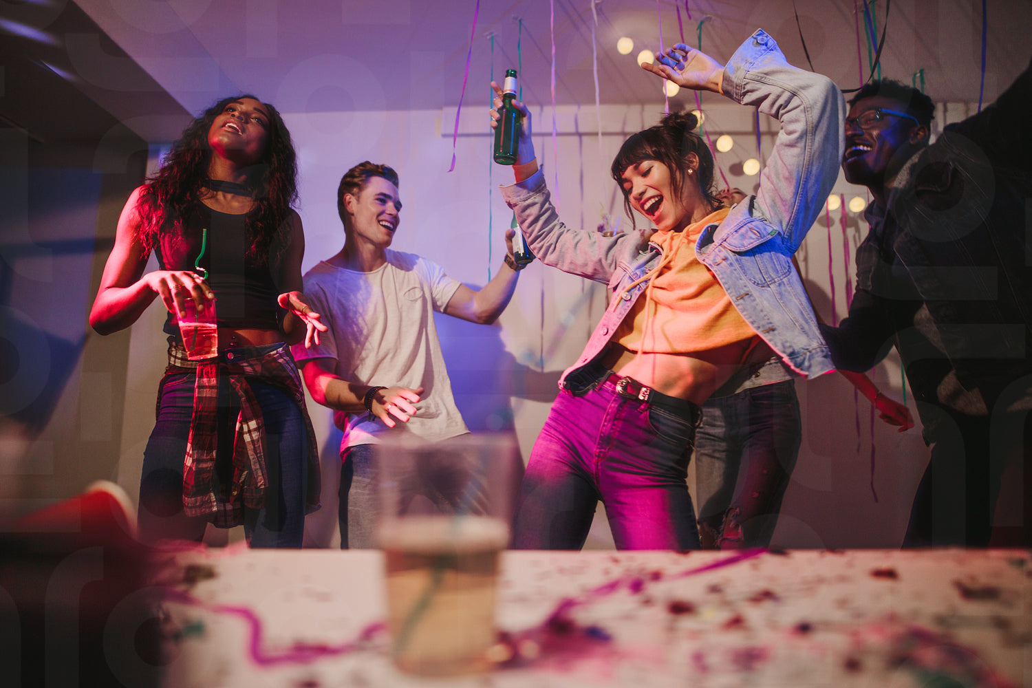 Young men and women having fun at a colorful house party. Friends dancing in joy holding drinks at a house party.
